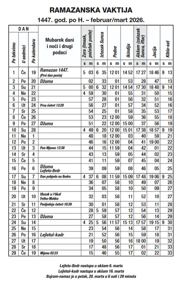 Zalaskom sunca u sredu, 18. februara, nastupa mesec Ramazan kada će biti klanjana prva teravija, a prvi dan posta je u četvrtak, 19. februara a poslednji u četvrtak 19. marta.